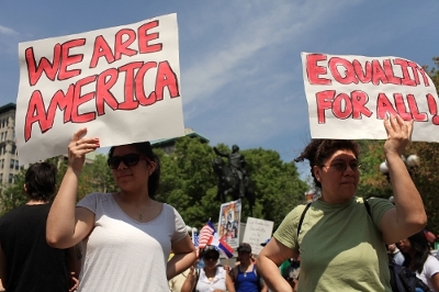 Người biểu tình chống lại đạo luật mới của Arizona tại New York vào ngày 1/5/2010, sau khi tiểu bang Arizona thông qua đạo luật đòi hỏi cá nhân bị nghi ngờ là người nhập cư bất hợp pháp phải trình giấy tờ chứng minh tình trạng cư trú khi được nhân viên công lực Arizona yêu cầu.