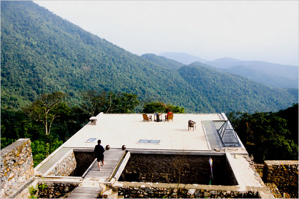 Và như vậy, nóc nhà đồng thời cũng là sảnh đón, chỗ ngồi chơi ngắm cảnh phóng tầm mắt ra không gian mênh mông xung quanh và nhìn xuống thung lũng. Muốn đi vào “kim tự tháp” sẽ phải qua một chiếc cầu lắt lẻo như để tĩnh tại và “tẩy trần”, rồi vòng quanh sân và chui xuống “cái bẫy”. Có vẻ hơi lắt léo, nhưng cũng chẳng có việc gì phải vội vã ở nơi đây cả!