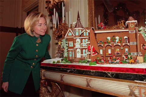 Cựu đệ nhất phu nhân Hillary Clinton chụp ảnh cạnh một chiếc bánh gừng trong Phòng Quốc tiệc do các đầu bếp Nhà Trắng tạo nên. Ảnh: AFP