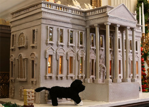 Đầu bếp Bill Yosses làm ra ngôi nhà bánh gừng năm 2009 bằng chocolate trắng. Chú chó Bo của gia đình Tổng thống Obama đứng canh cổng. Ảnh: AFP