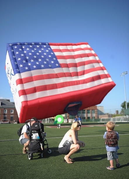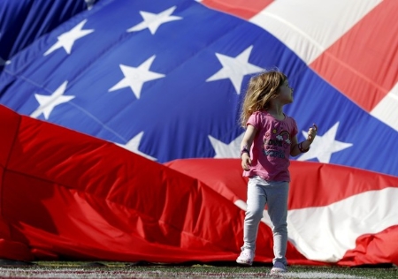Hình ảnh lá cờ Mỹ xuất hiện khắp nơi. Có cả những lá cờ khổng lồ khiến bé gái này ngạc nhiên.
